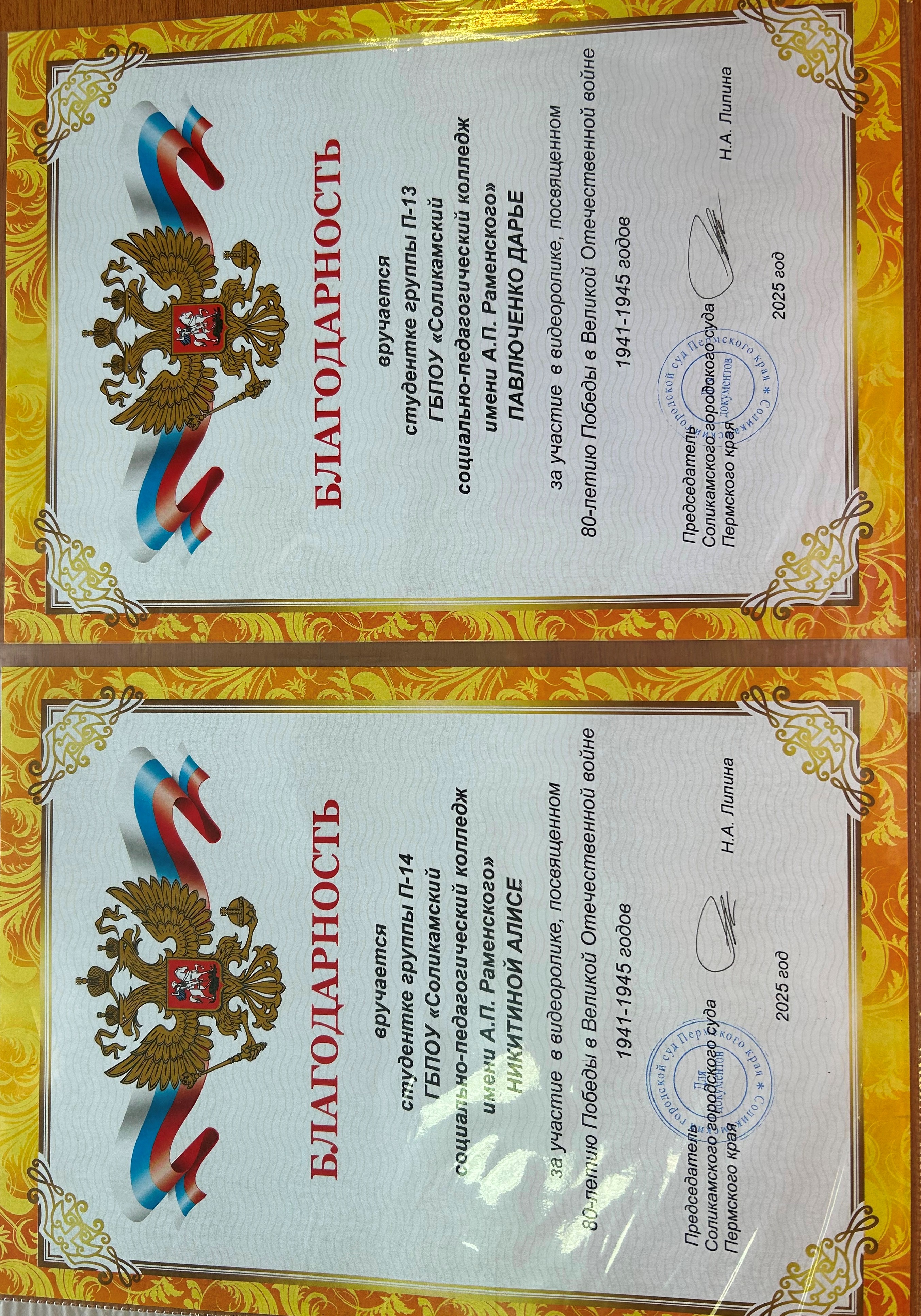 27 мая 2025 года председатель Соликамского городского суда Пермского края Липина Нина Александровна за участие в видеоролике, посвященном 80-летию Победы в Великой Отечественной войне 1941-1945 годов, подготовленным судом совместно с прокуратурой г. Соликамска, администрацией Соликамского муниципального округа, отделом полиции и медиатором, вручила благодарности студенткам группы П-13 ГБПОУ «Соликамского социально-педагогического колледжа имени Раменского» Дарье Павлюченко и группы П-14 Алисе Никитиной