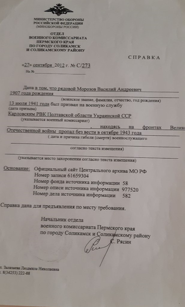 «На фронтах Великой Отечественной войны у нас в семье пропал без вести мой дедушка – Морозов Василий Андреевич, 1907 года рождения. Он был призван на военную службу 13 июля 1941 года в Полтавскую область Украинской ССР. В октябре 1943 года дедушка пропал без вести. В память о дедушке осталась только фотография и справка военного комиссариата».