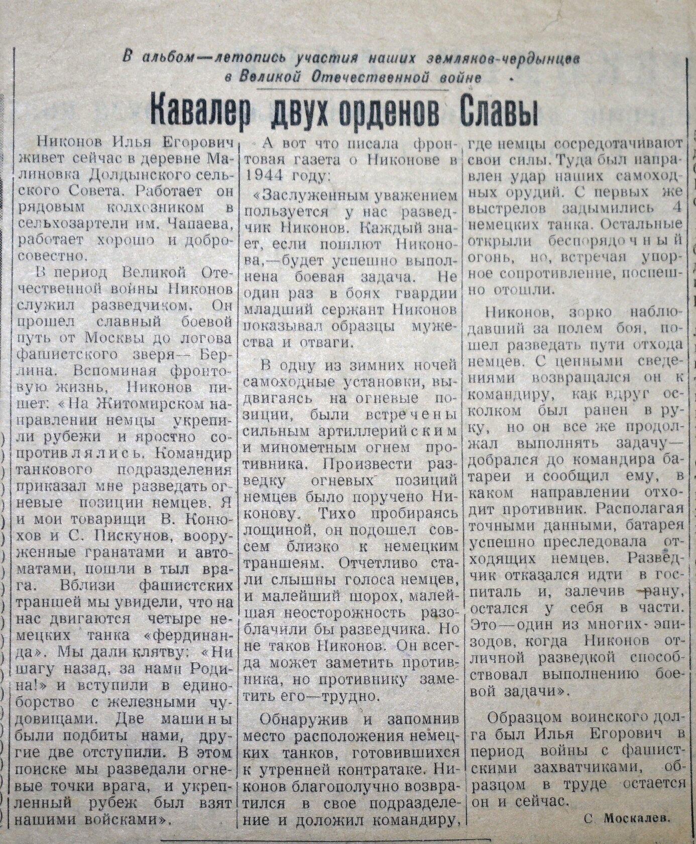 Мой прапрадедушка Никонов Илья Егорович во время войны был разведчиком. У него очень много орденов и медалей. За боевые действия дедушка награжден орденом «Красная звезда», двумя орденами Славы.